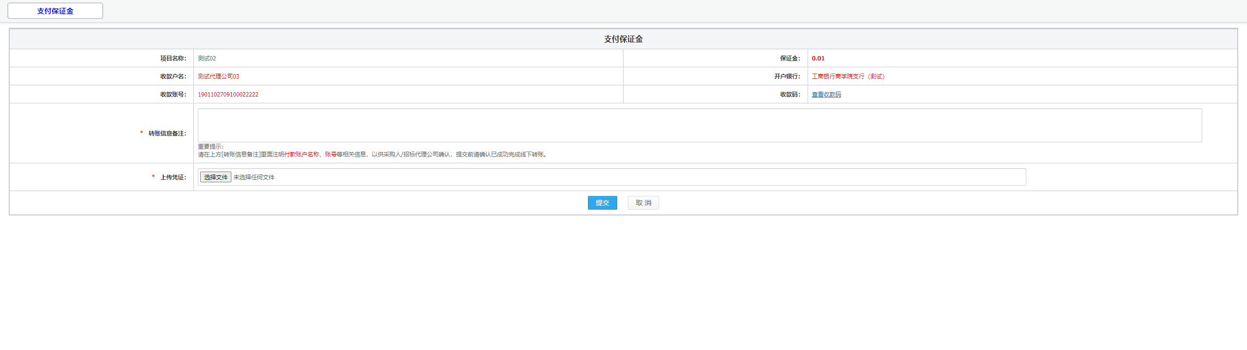 (三)在支付保证金页面,可查看代理公司的收款户名、开户银行、收款账号及收款码,您可选择线下支付或扫码支付。支付完成后,请填写转账信息并上传转账凭证(含银行转账记录或支付截图);代理公司收到申请并确认后,该笔支付即完成。支付成功后,您可正常参与项目的投标报价。请注意,平台仅向用户提供系统软件使用权,不负责审核项目真实性,亦不收取任何标书费或保证金。请您在付款前务必确认项目真实性及付款信息。